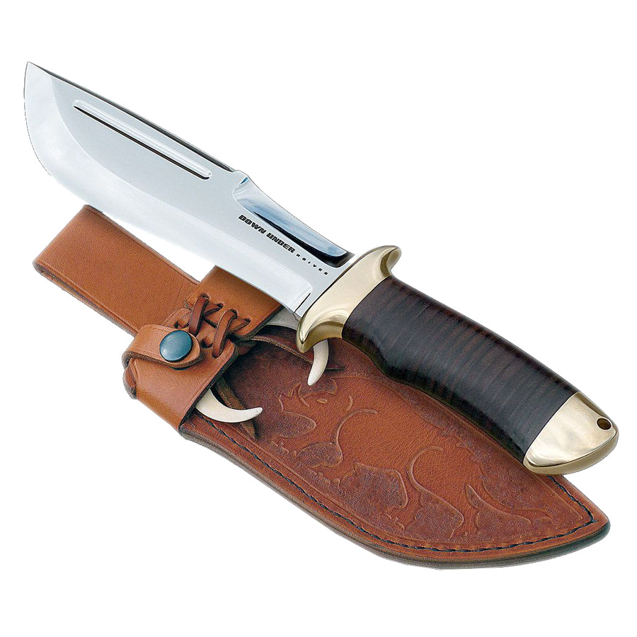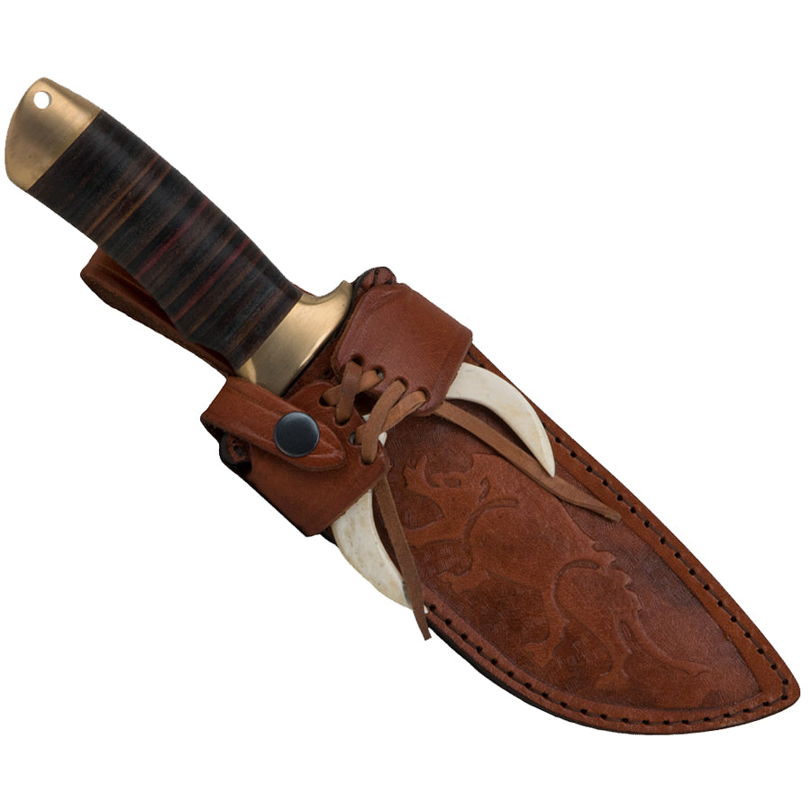 Puolitang-rakenne ja täysnahkainen kahva tarjoavat varman otteen kaikissa olosuhteissa niin märissä kuin kuivissa. Lisäksi mukana tulee yksilöllisesti muotoiltu raskas nahkatuppi, jossa on aidot luukoristeet ja pikalukitus. Erinomainen valinta metsästys- tai retkeilyveitseksi.