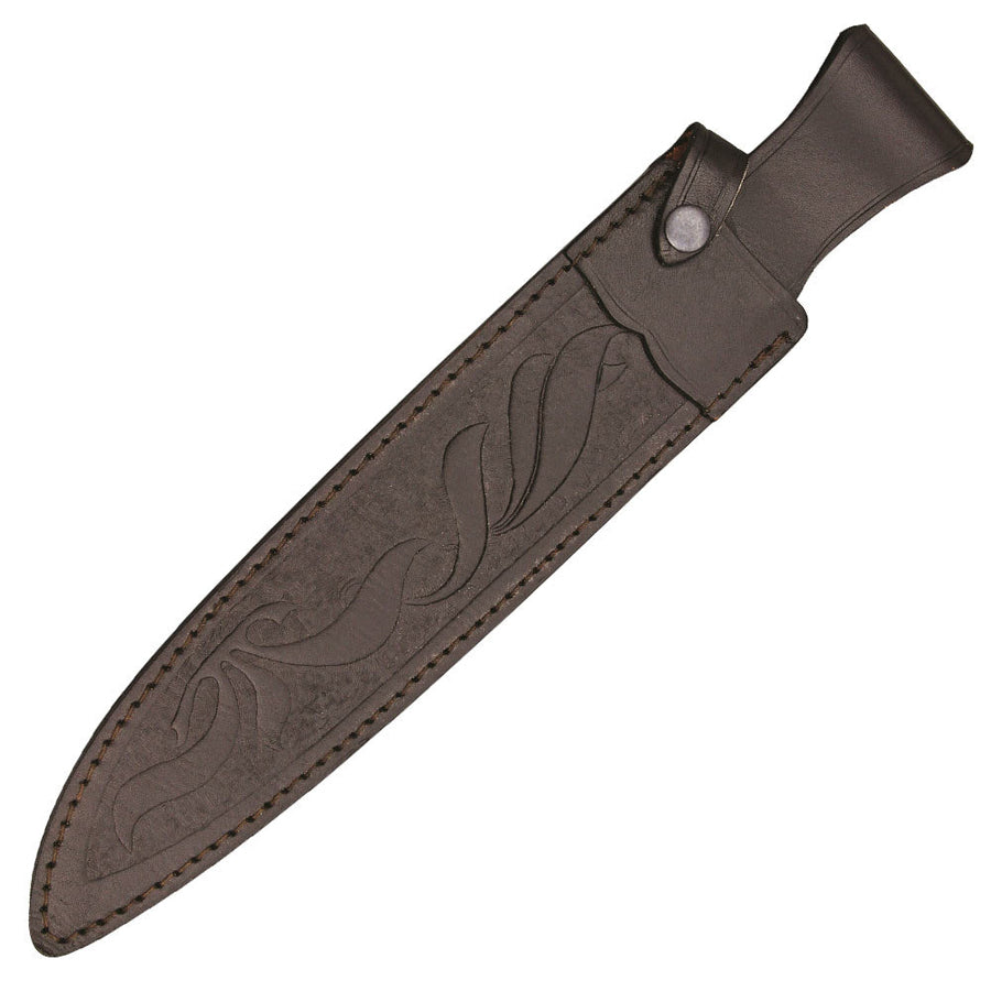 Tämä veitsi toimitetaan antiikkisen ilmeen omaavalla mustanruskealla huotralla, jossa on klassisen vanhanaikainen kukkakuvio ja se sopii erinomaisesti metsästys- ja eräveitseksi.